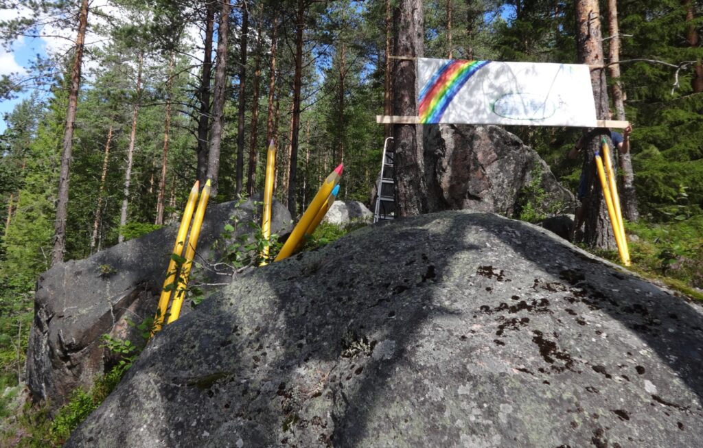 Inspirert av Alf Prøysens vise om blanke ark og fargestifter. Men også reusltat av mange tanker rundt hele prosjektet “Kul Tur Ute”. Det å se nye muligheter og bruke dem i en tid der alt er kortvarig og fragmentarisk. Installasjonen viser en tegnet regnbue og Ringhavet, et lite sirkulært vann i Kongsvingers del av Finnskogen